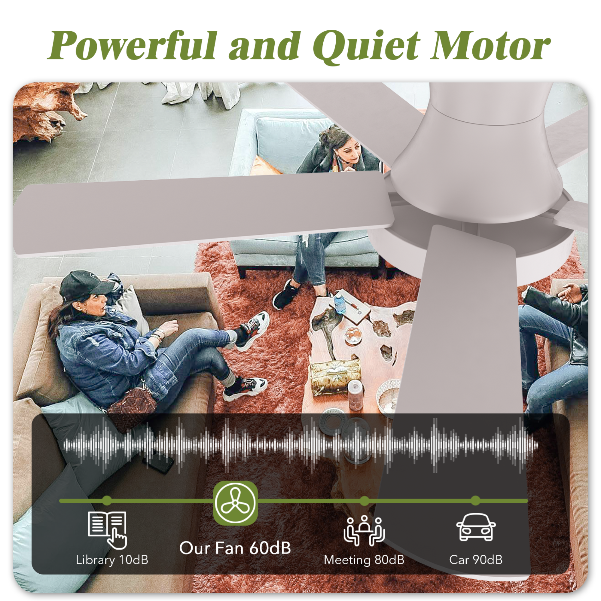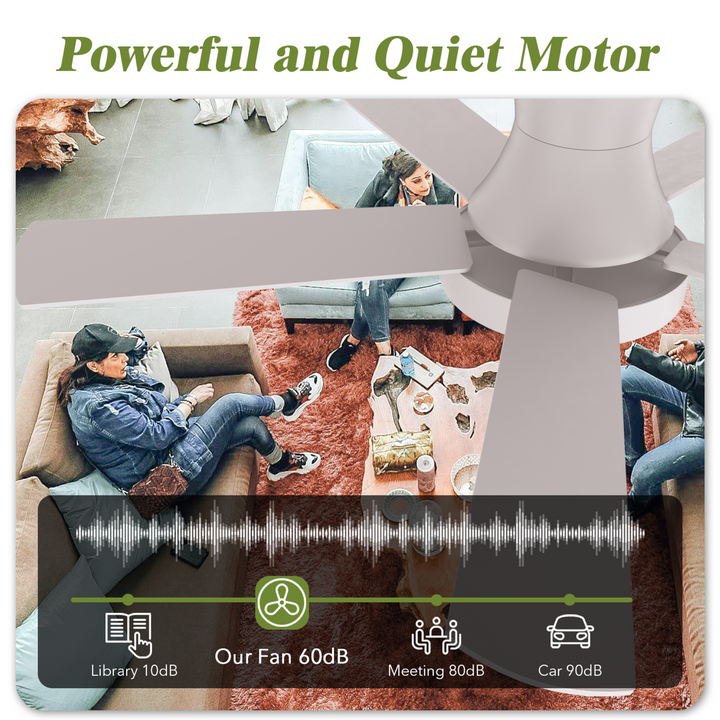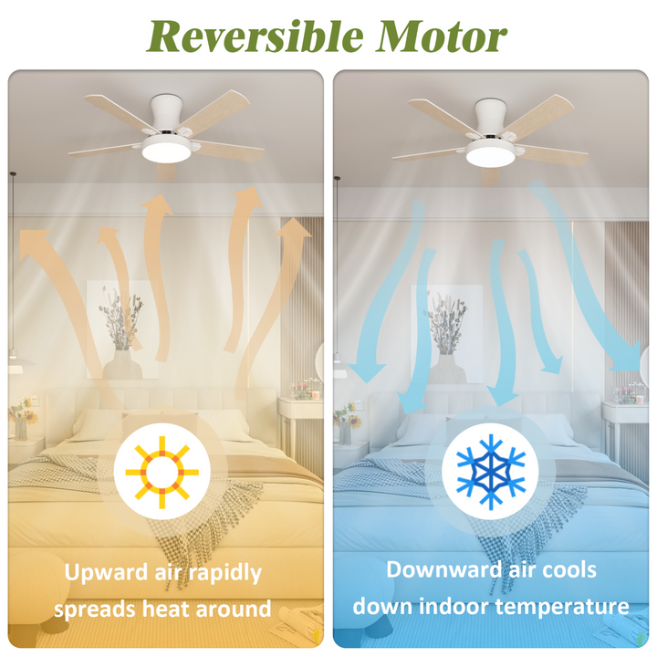Equipped with a high performance matte DC motor, this ceiling fan delivers robust airflow while operating with remarkable quietness, generating less than 60 decibels of noise. The reversible function of the DC motor enables seamless switching of the fan's direction. In summer, it provides a refreshing downward airflow, while in winter, it reverses to an upward airflow, effectively accelerating room air circulation. This not only enhances comfort but also helps reduce energy costs.