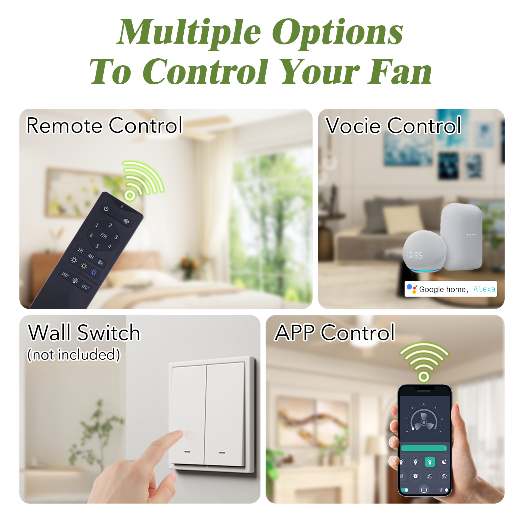 Our 42 inch led ceiling fan with light comes with a comprehensive multi function remote control. Also this ceiling fan with remote Support Amazon Alexa and Google Home Assistant App,It offers 6 adjustable fan speeds, 3 color temperature settings, and a reverse airflow option, providing you with total control over your ceiling fan. The remote control is powered by 2 AAA batteries(not included)