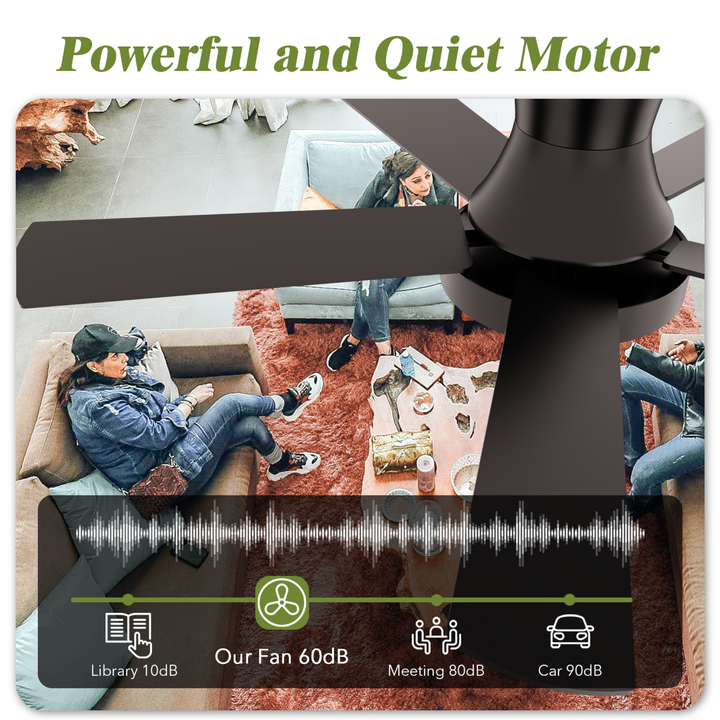 Equipped with a high performance matte DC motor, this ceiling fan delivers robust airflow while operating with remarkable quietness, generating less than 60 decibels of noise. The reversible function of the DC motor enables seamless switching of the fan's direction. In summer, it provides a refreshing downward airflow, while in winter, it reverses to an upward airflow, effectively accelerating room air circulation. This not only enhances comfort but also helps reduce energy costs.