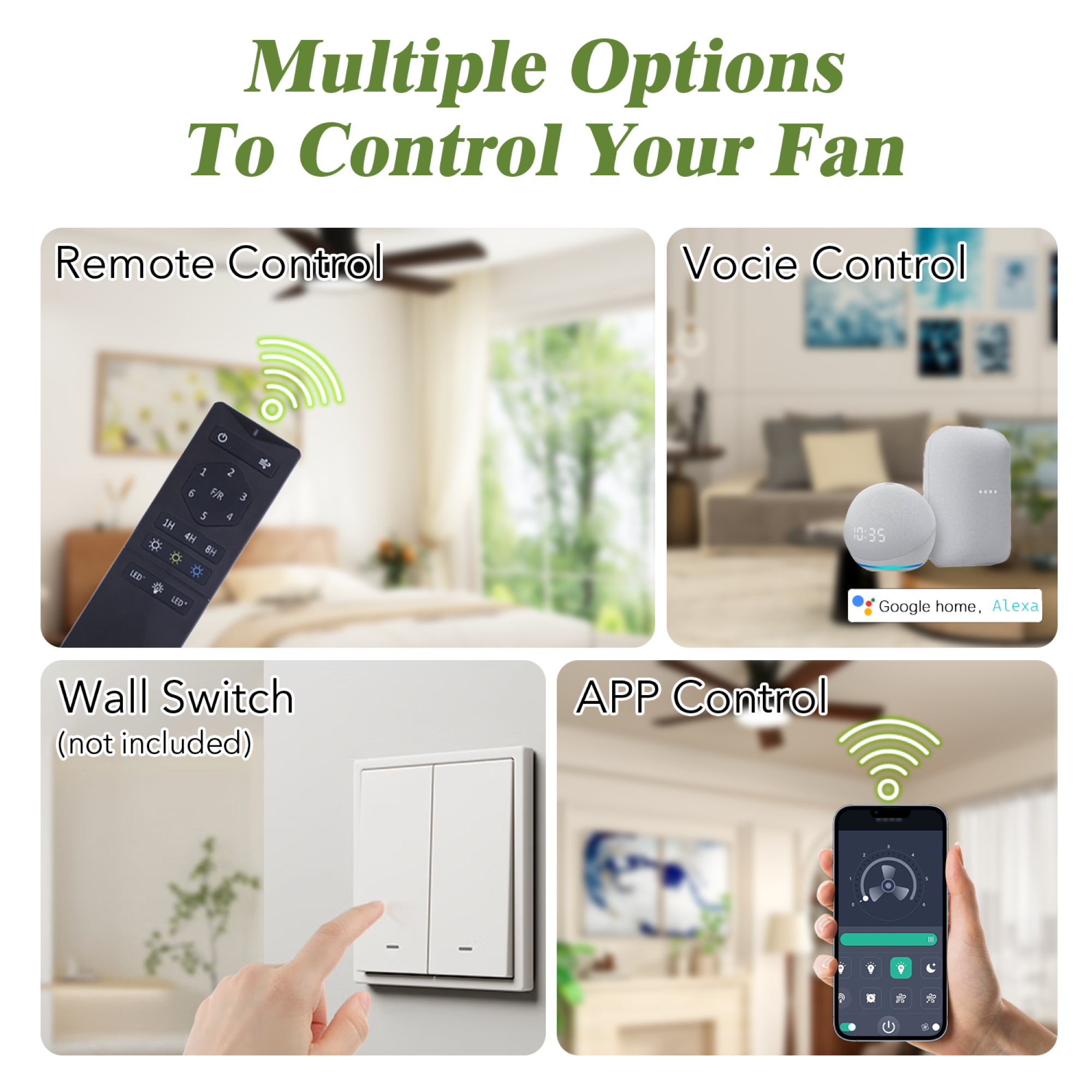 Our 42 inch led ceiling fan with light comes with a comprehensive multi function remote control. Also this ceiling fan with remote Support Amazon Alexa and Google Home Assistant App,It offers 6 adjustable fan speeds, 3 color temperature settings, and a reverse airflow option, providing you with total control over your ceiling fan. The remote control is powered by 2 AAA batteries(not included)