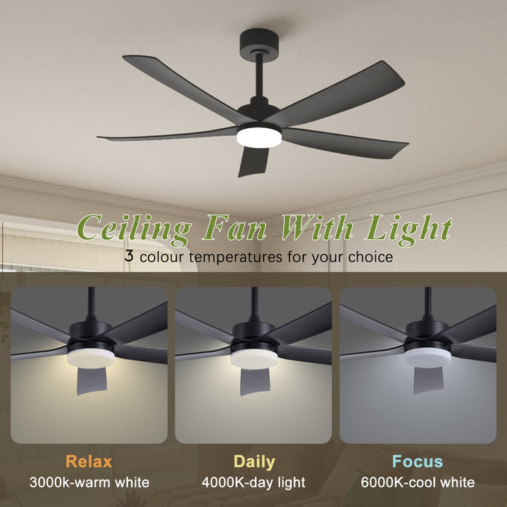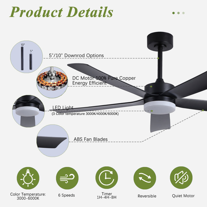 This 52-inch ceiling fan offers a low-profile design and integrated LED lighting. Control is simple with the included remote or via the Tuya Smart App, compatible with Alexa and Google Assistant for voice control. Enjoy dimmable lighting (10%-100%) and adjustable color temperature (3000K, 4000K, 6000K) to create the perfect ambiance in your bedroom or living room. The ultra-quiet DC motor ensures a peaceful atmosphere. This ceiling fan is reversible for year-round comfort.