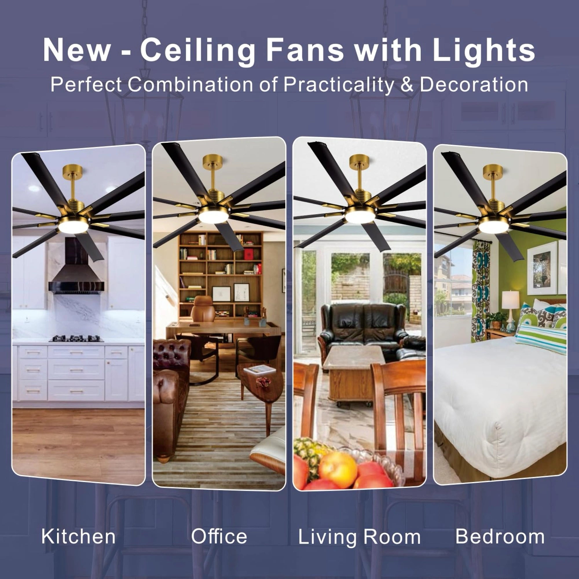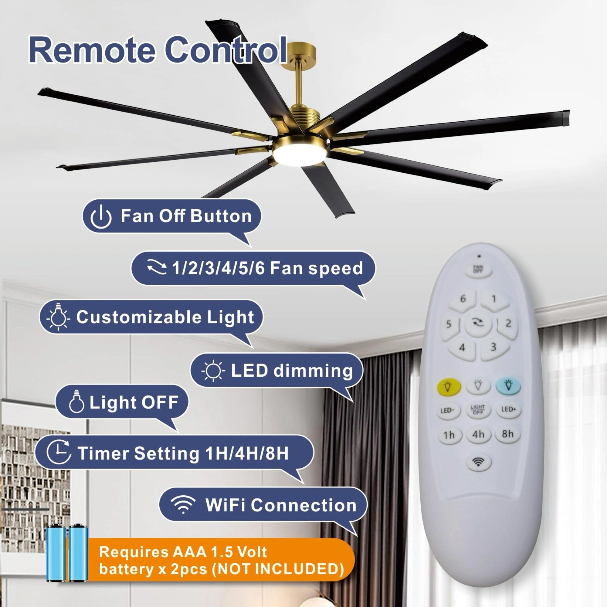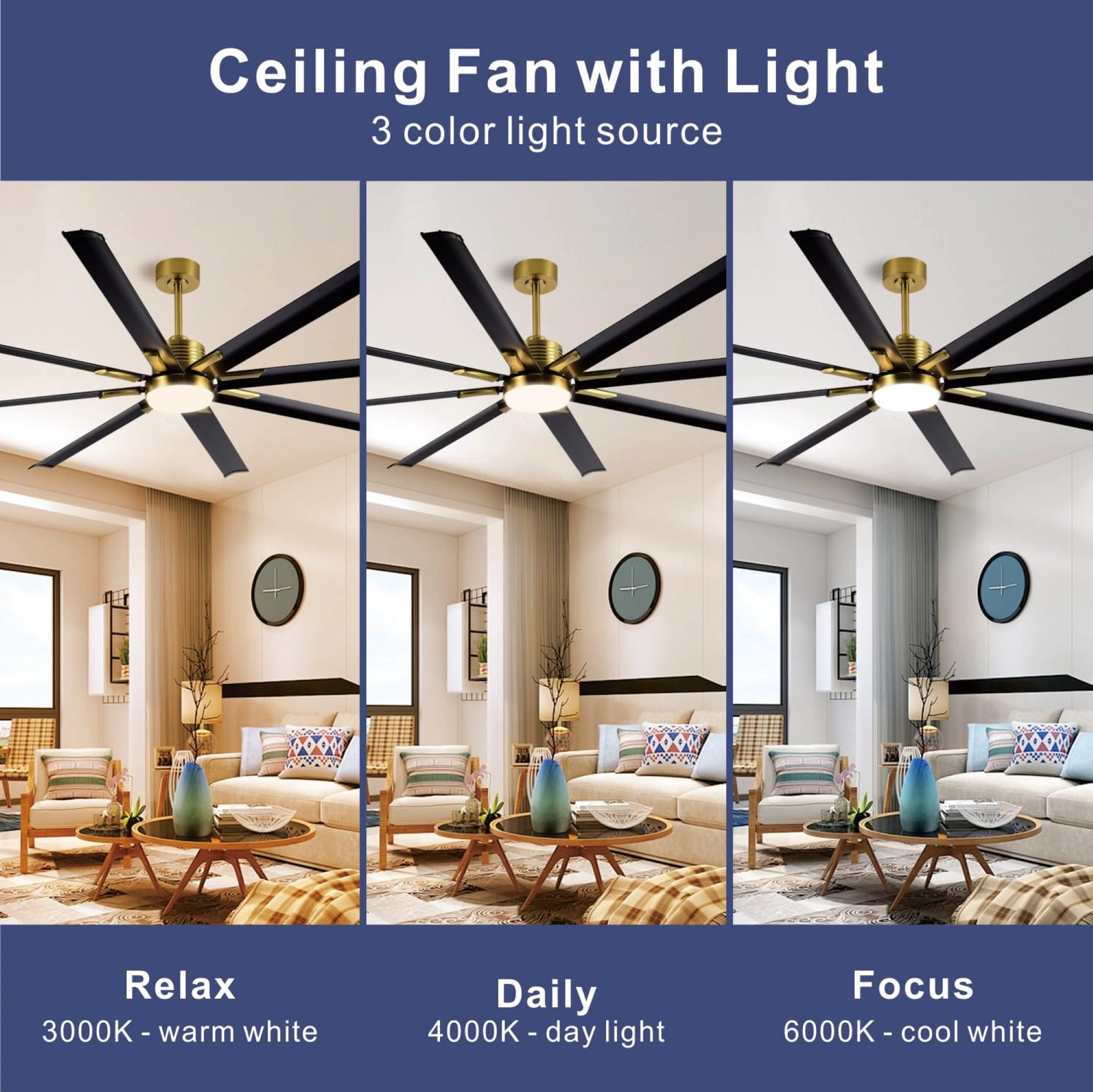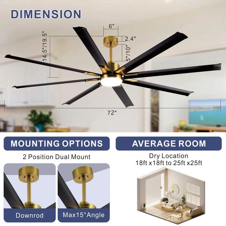 ย ย The 72" ceiling fan is equipped with APP & Remote Control, 10~100% Dimmable, Stepless Color Temperature (warm โ neutral โ cool white), Memory Function (the memory function retains your settings), , featuring 22W, 1760LM led light.,you can effortlessly switch between these settings. Whether you're unwinding after a long day, focused on work, or hosting guests, the ideal ambiance is just a click away.