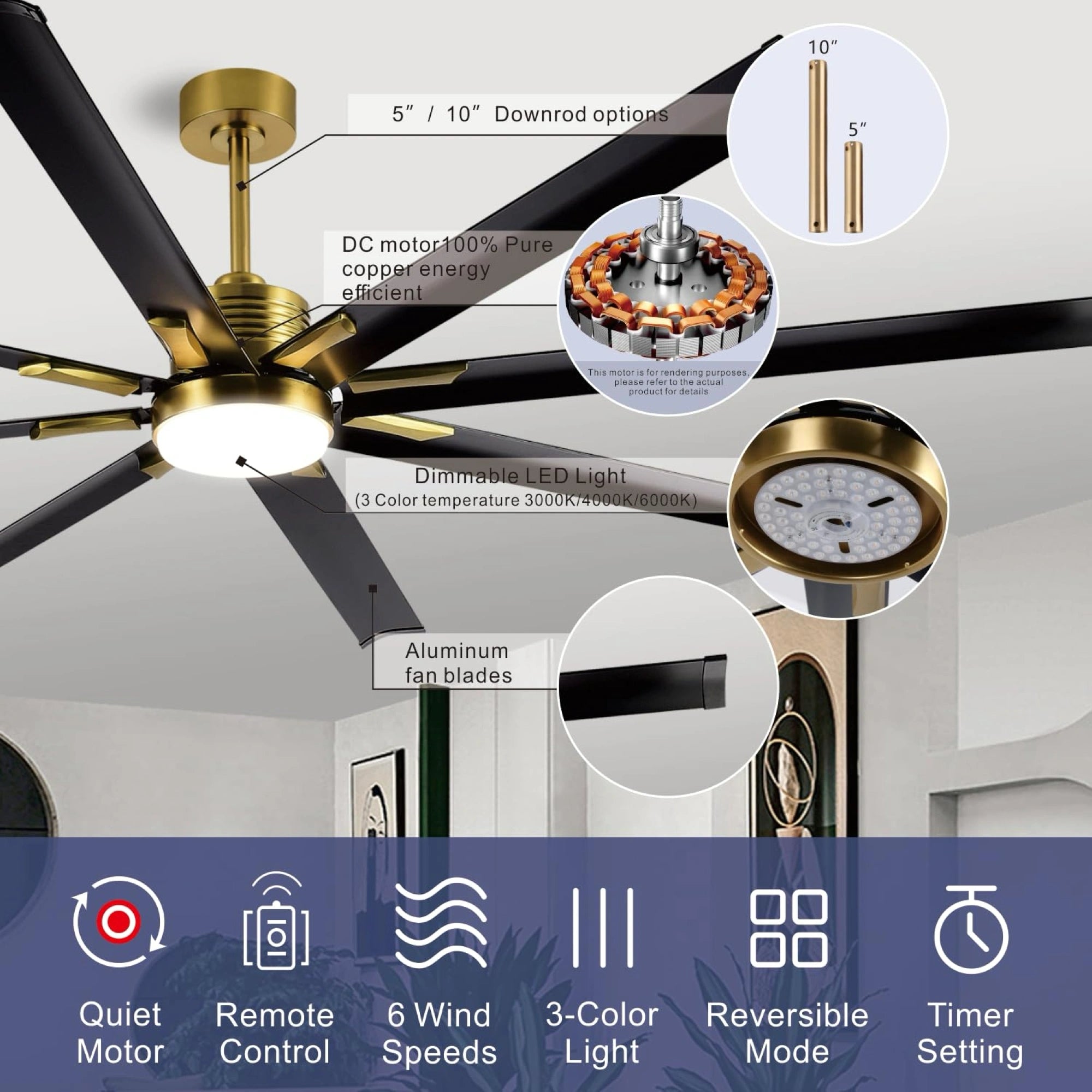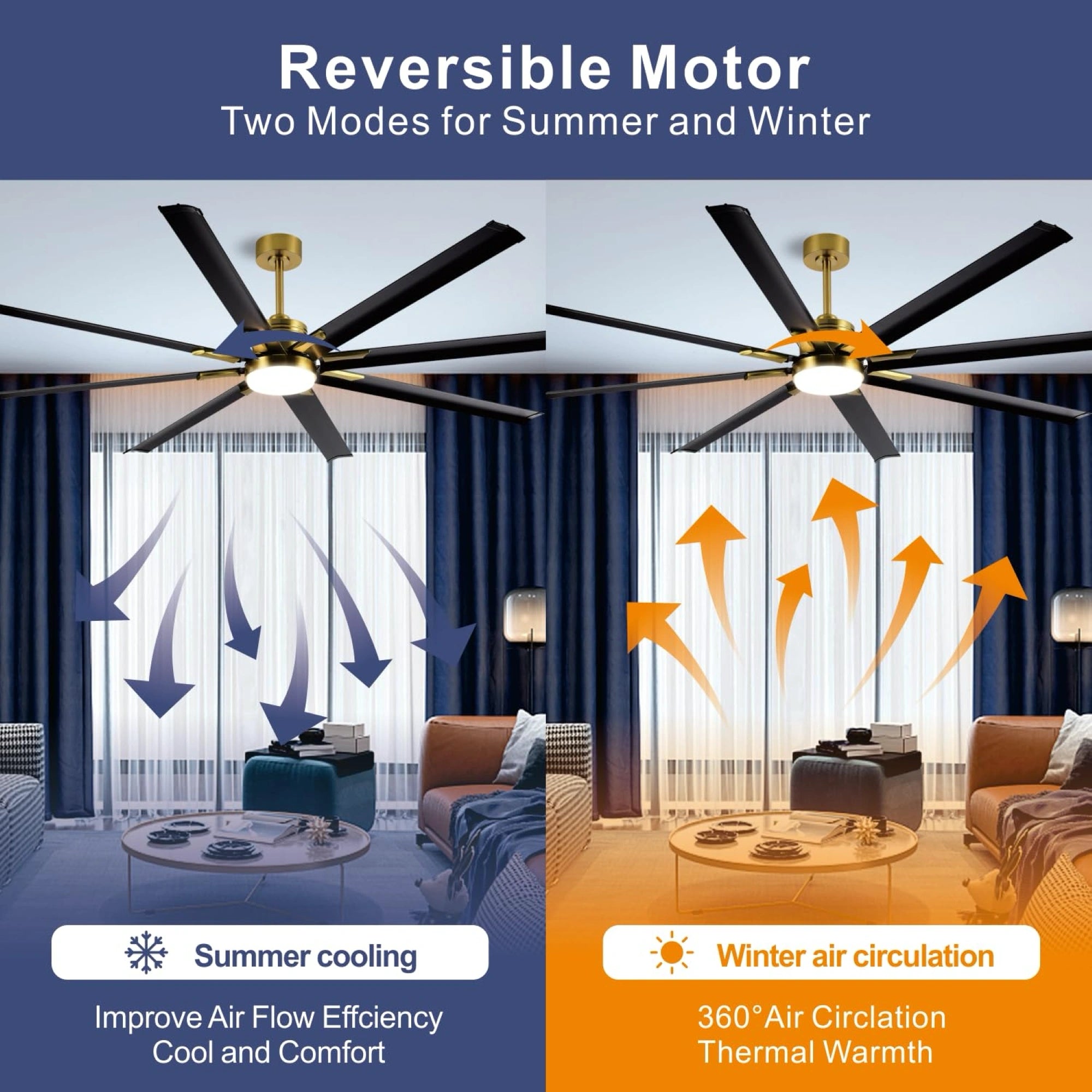 ย ย 6520 CFM professional grade air volume, paired with 8 large Aluminum angle blades, increases wind power by 40% at the same speed, instantly dispelling stuffiness, providing a cool and direct summer experience, balancing room temperature in winter, and reducing energy consumption by 30%