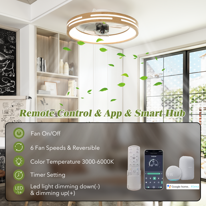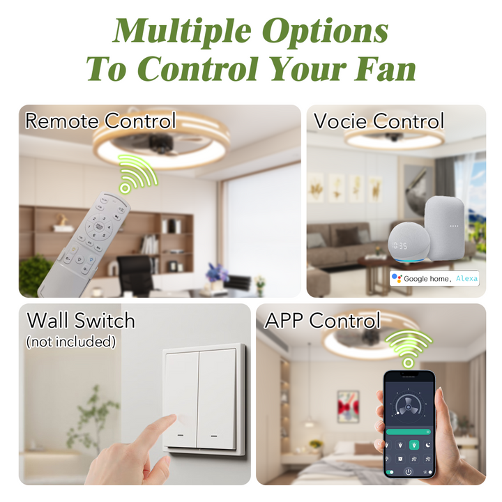 Use the included remote, Tuya Smart app, or voice commands (Alexa/Google) to adjust fan speed, light, and settings from anywhere