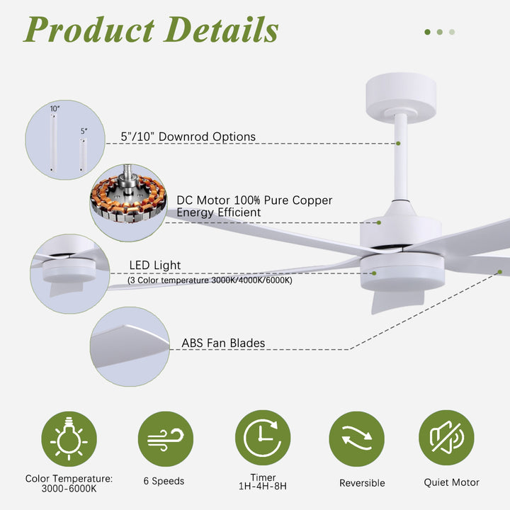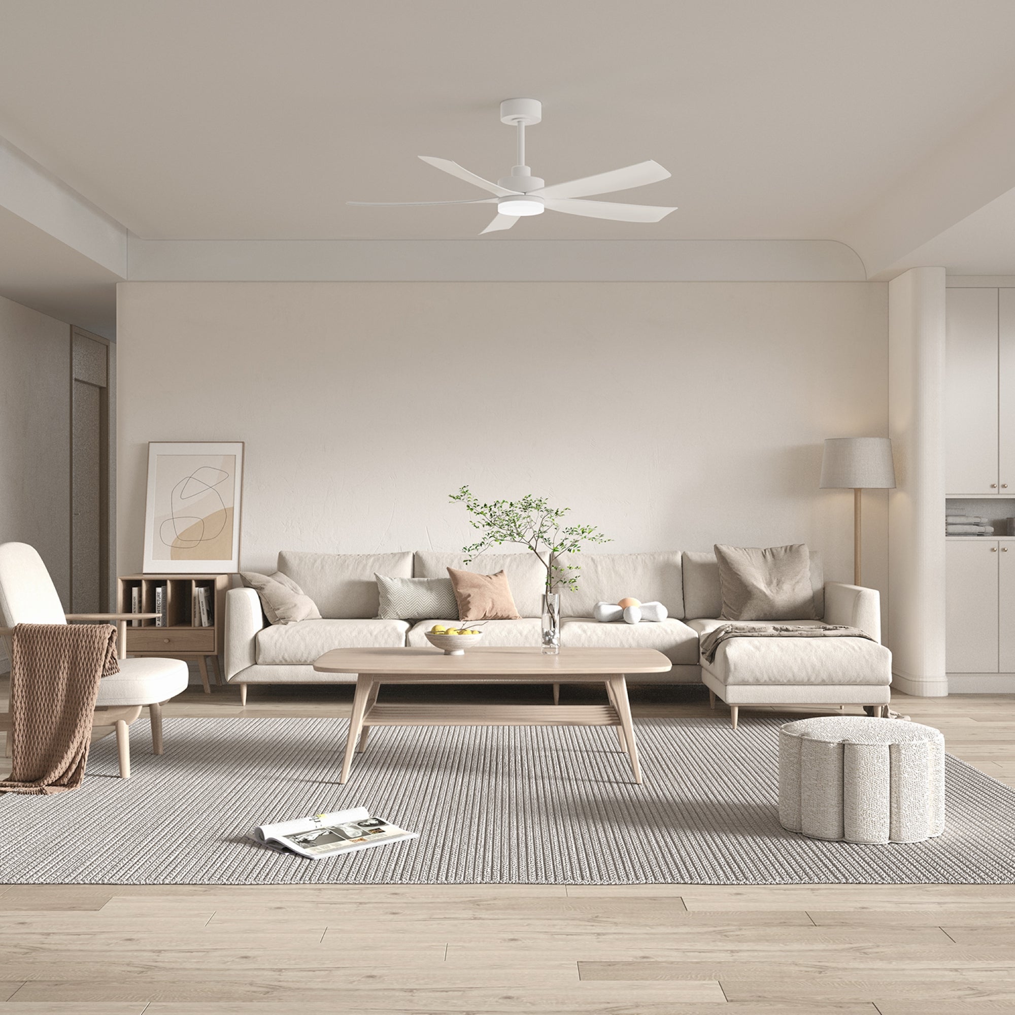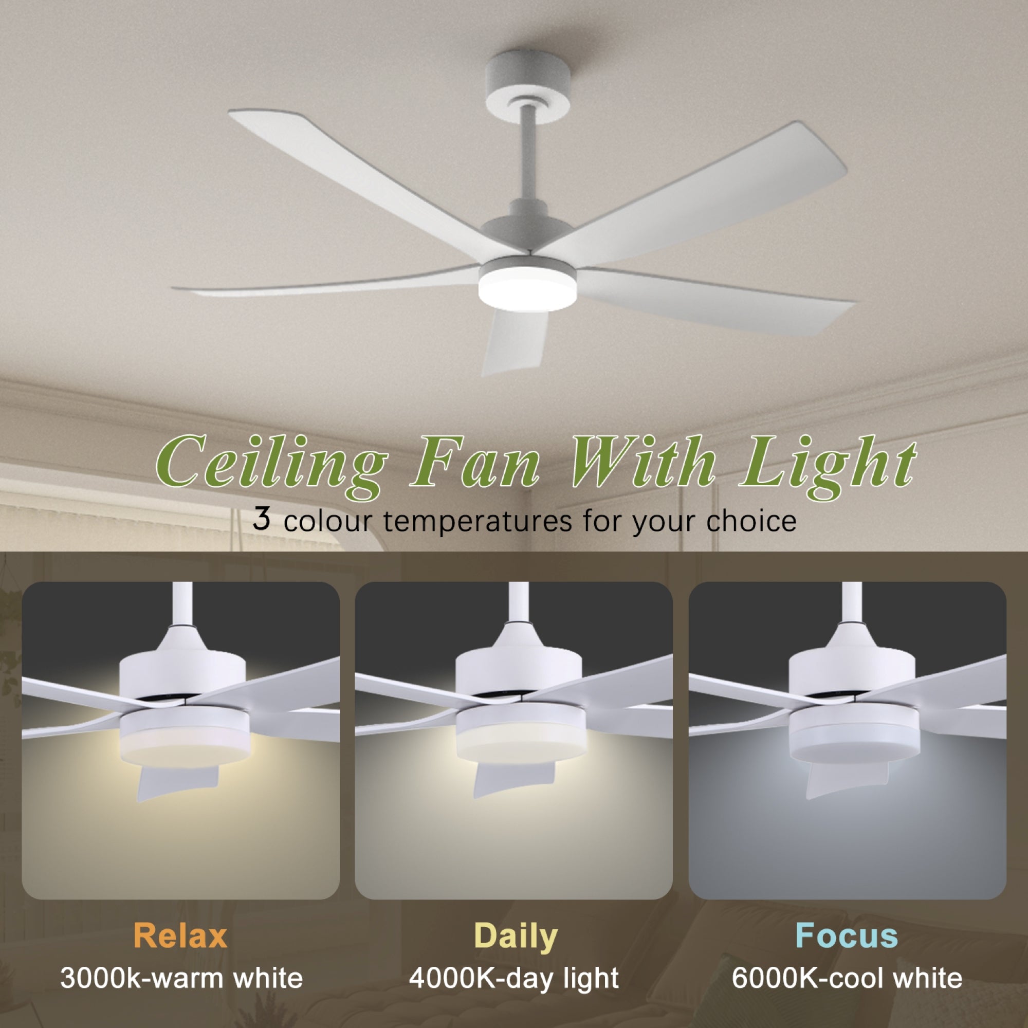 This 52-inch ceiling fan offers a low-profile design and integrated LED lighting. Control is simple with the included remote or via the Tuya Smart App, compatible with Alexa and Google Assistant for voice control. Enjoy dimmable lighting (10%-100%) and adjustable color temperature (3000K, 4000K, 6000K) to create the perfect ambiance in your bedroom or living room. The ultra-quiet DC motor ensures a peaceful atmosphere. This ceiling fan is reversible for year-round comfort.