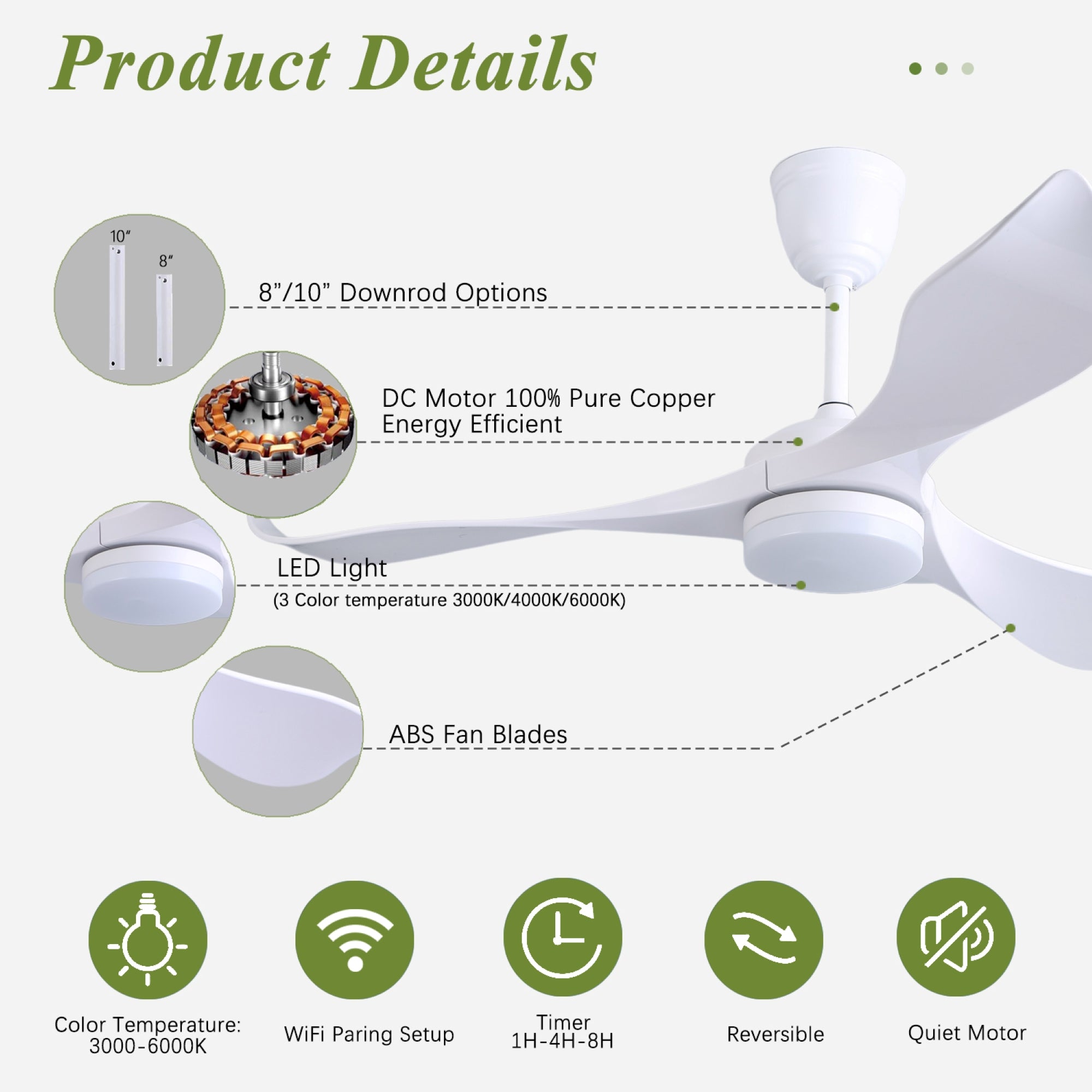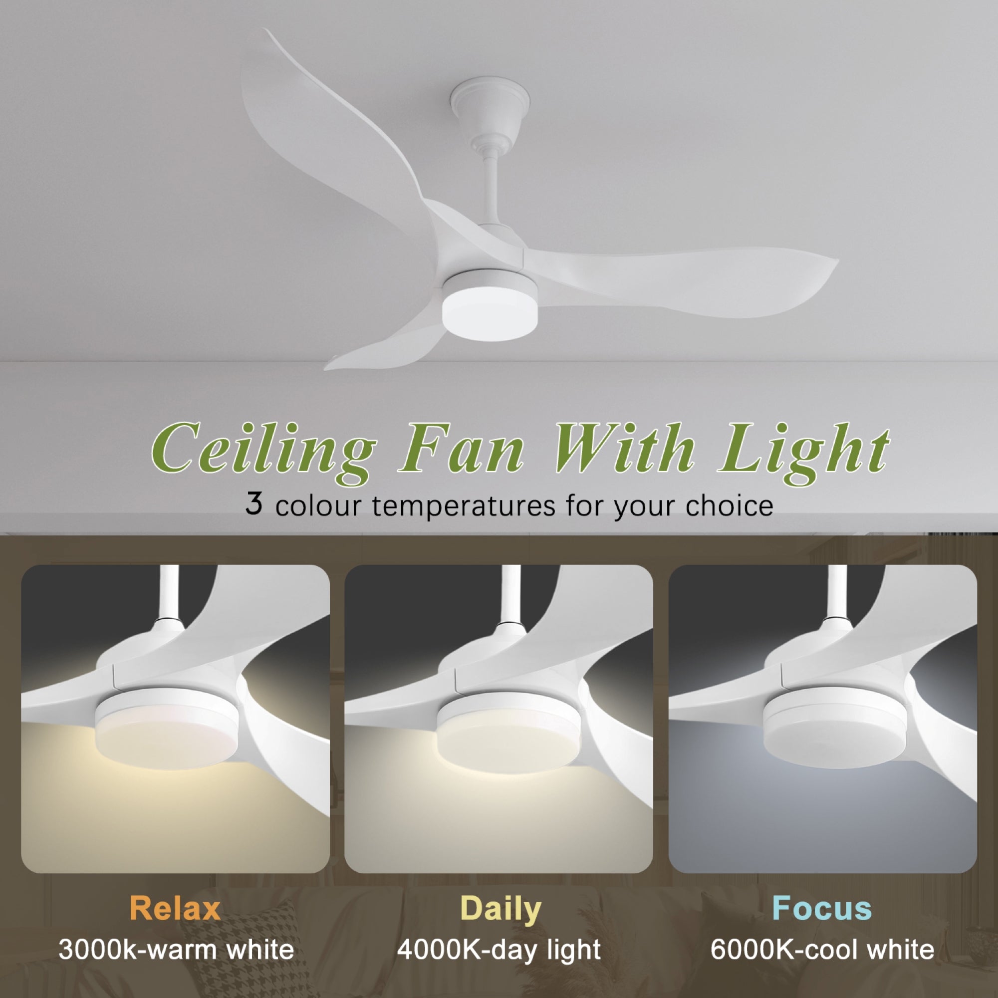 Control everything with the remote or Tuya Smart App. Adjust 6 fan speeds, choose from 3 light colors (warm to cool white), set timers (1/4/8 hours), and run fan & light independently